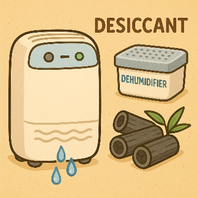 제습제는 보통 염화칼슘이나 실리카겔 등 수분 흡수 능력이 있는 화학물질로 구성되어, 습기를 흡수해 액체로 바꾸는 방식의 소형 일회용 제습제품입니다. 서랍, 신발장, 옷장 등 밀폐된 소규모 공간에서 주로 사용됩니다.
